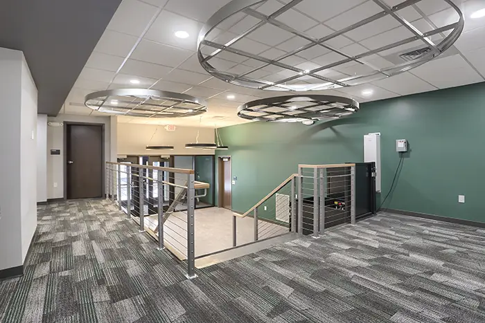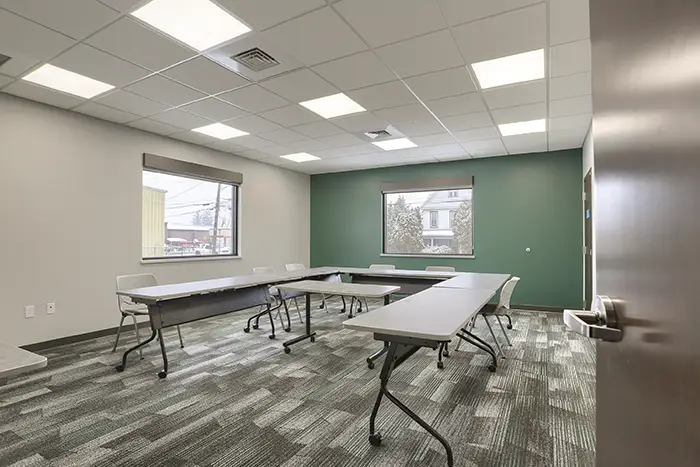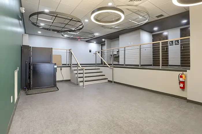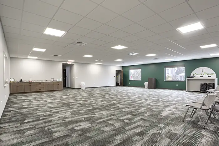 Adaptive re-use renovation and full site construction to repurpose multiple spaces into a lobby, public restrooms, community room, conference room and kitchenette. The library features new interior partitions, flooring, finishes, ceiling, painting and mechanical, plumbing, and electrical upgrades. Exterior updates with new roofing, siding, windows, and ramp.