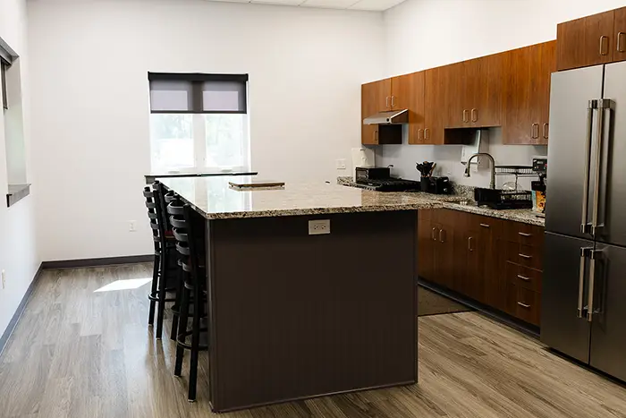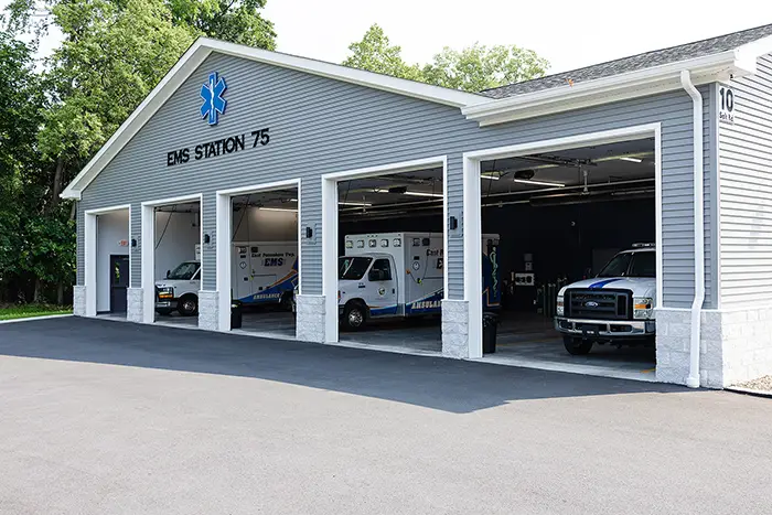 New 7,000 SF, 5-bay ambulance facility designed for 24/7 operations. The live-in station includes staff quarters, a kitchen and dining area, training spaces, and administrative offices for a modern home base for EMS crews. The new building consolidated apparatus storage and crew accommodations to support faster response, on-site training, and improved readiness for emergency and non-emergency transports.